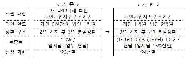 개인사업자 1억 원 법인사업자 2억 원입니다. 이 한도는 기존 개인한도 5천만 원, 법인한도 1억 원에서 증액된 한도입니다. 따라서 기존에 저금리 대환대출을 받은 소상공인은 증액된 한도 내에서 추가로 대출이 가능합니다.