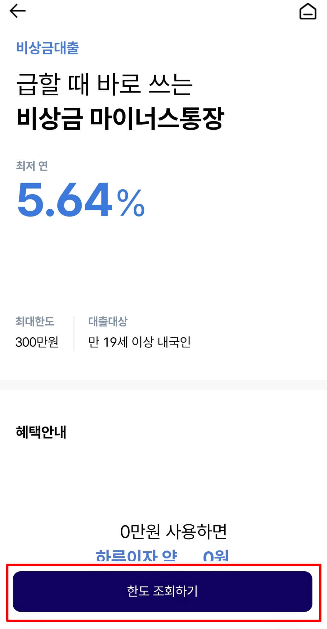 👉 대출상품 중 비상금대출을 선택합니다. 한도 조회하기를 클릭하여 대출을 진행하시면 됩니다.