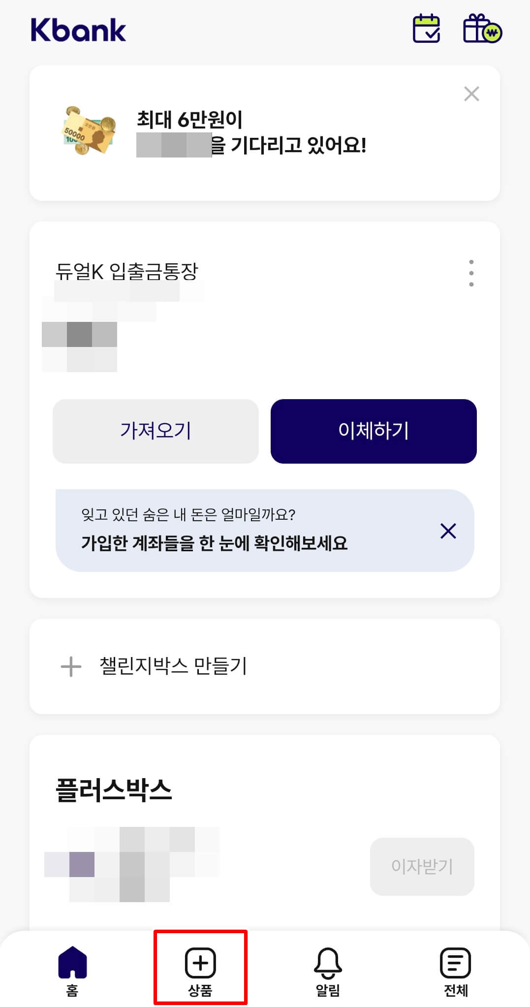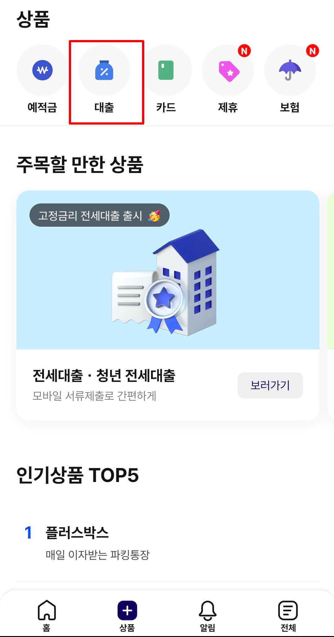 👉케이뱅크 메인화면에서 하단 상품을 클릭합니다. 다음화면에서 상품 중 대출을 클릭합니다.