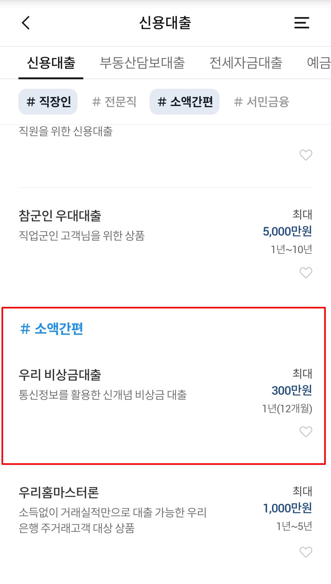 우리은행 모바일 앱 접속 후 대출상품에서 신용대출 중 #소액간편을 클릭하시면 우리 비상금대출이 보입니다.