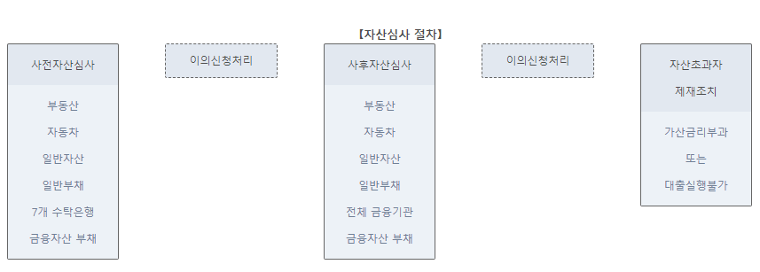 먼저 부동산, 일반자산, 비금융자산과 수탁은행(우리, 국민, 농협, 신한, 하나, 대구, 부산은행)의 금융자산 과 부채를 우선 수집해 사전 심사후 사회보장정보원을 통해 수집된 금융기관의 금융자산과 부채로 사후 자산심사를 실시합니다.