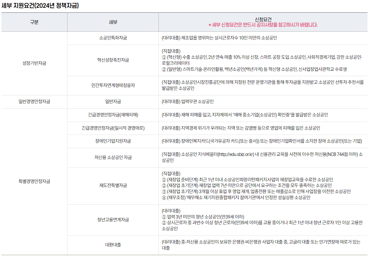 소상공인 정책자금 종류에 따라 자세한 지원대상은 아래 이미지를 참고하시기 바랍니다.