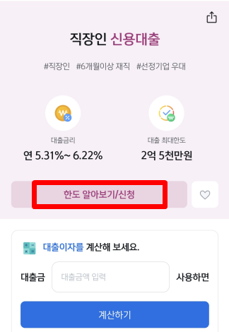 대출한도는 최대 2억 5천만 원까지 가능하며 마이너스통장의 경우 최대 1억까지 가능합니다. 대출금리는 연 최저 5.32% ~ 6.22%입니다.